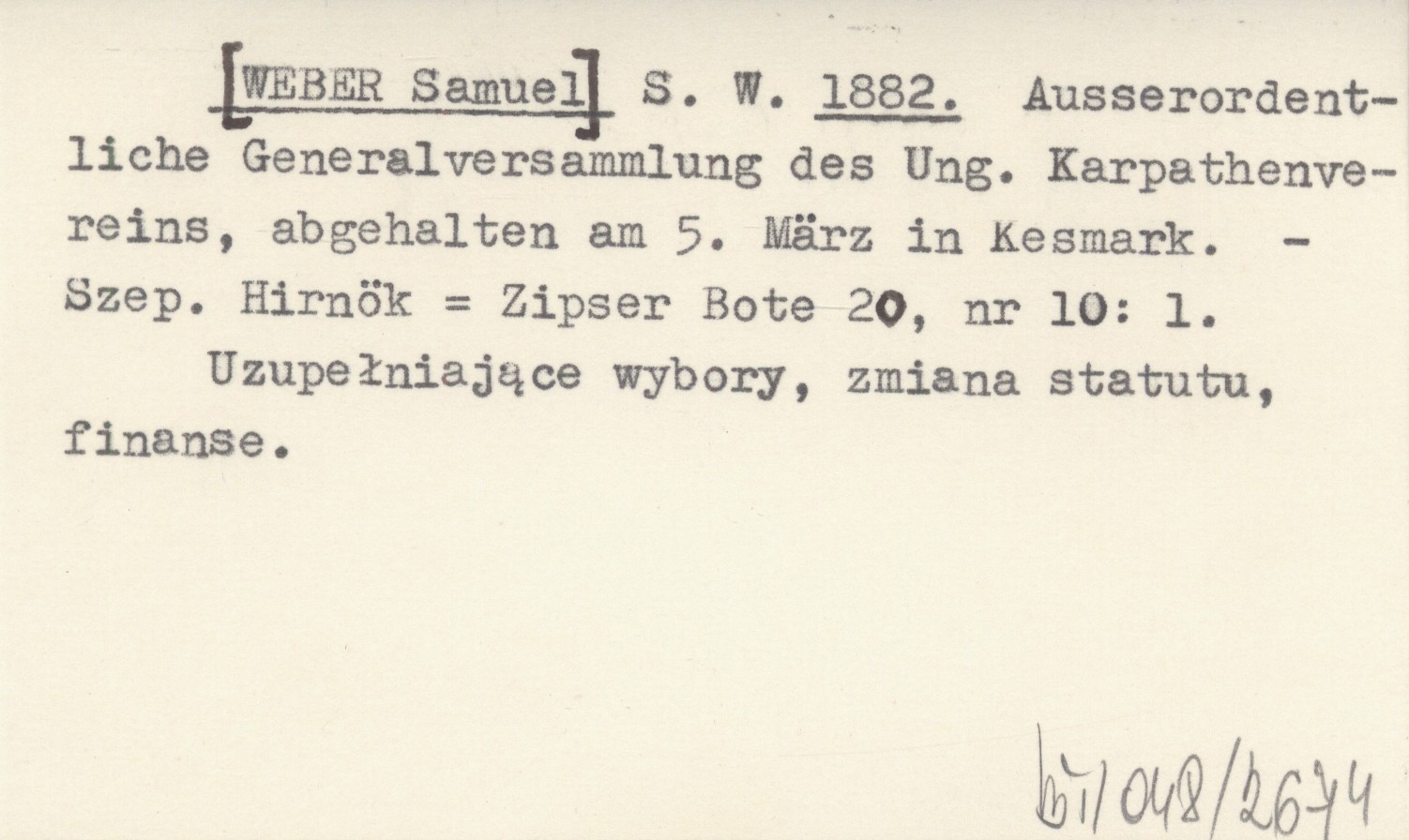 S. W. [WEBER Samuel] 1882 Ausserordentliche Generalversammlung des Ung. Karpathenvereins, abgehalten am 5. März in Kesmark.