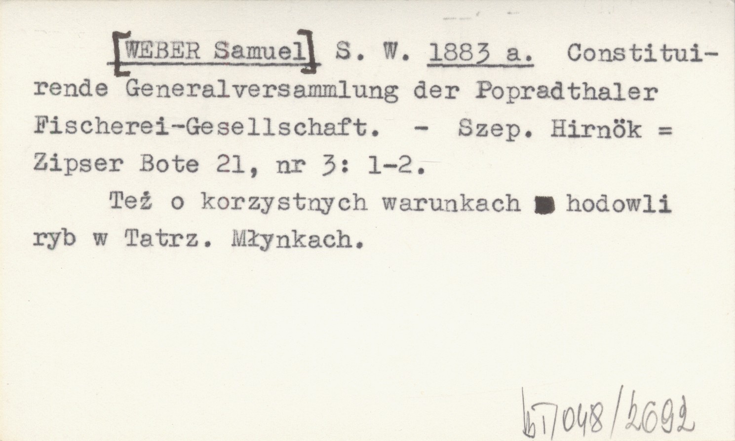 S. W. [WEBER Samuel] 1883 a Constituirende Generalversammlung der Popradthaler Fischerei-Gesellschaft.