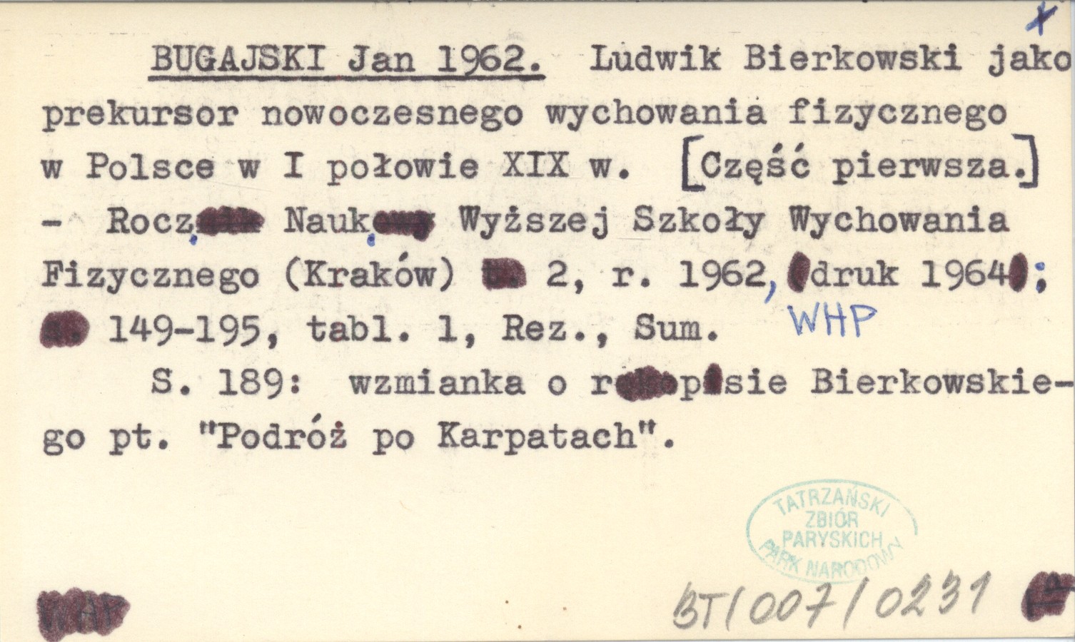 Rocznik Naukowy Wyższej Szkoły Wychowania Fizycznego (Kraków) , 2, r. 1962, druk 1964: 149-195, 1 k., Rez., Sum. S. 189: wzmianka o rękopisie Bierkowskiego pt. "Podróż po Karpatach".