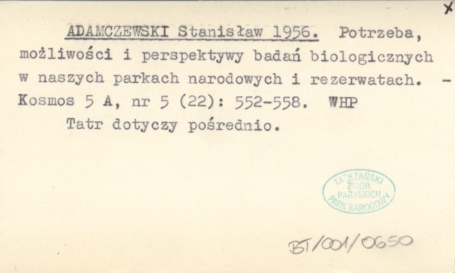 ADAMCZEWSKI Stanisław 1956 Potrzeba, możliwości i perspektywy badań biologicznych w naszych parkach narodowych i rezerwatach.