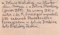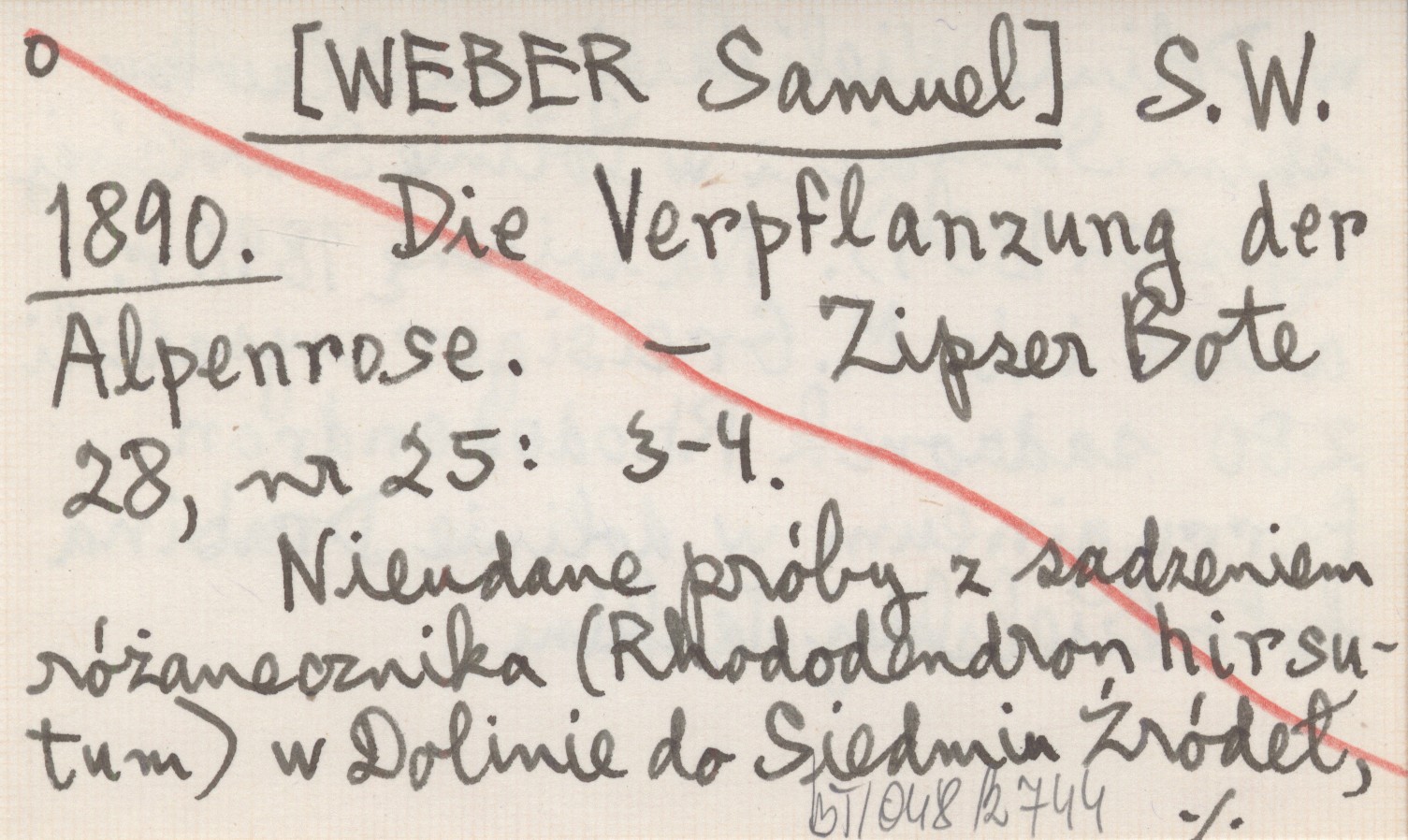 Zipser Bote, 28, nr 25: 3-4. Nieudane próby z sadzeniem różanecznika (Rhododendron hirsutum) w Dolinie do Siedmiu Źródeł, w Dolinie Wielickiej, na Sławkowskim Szczycie i w Dolinie Staroleśnej (jesień 1889). Na wiosnę 1890 r. autor i dr M. Greisiger wysadzili 280 sadzonek Rhododendron ferrugineum w dolinie Drabina koło Bielskiej Jaskini.