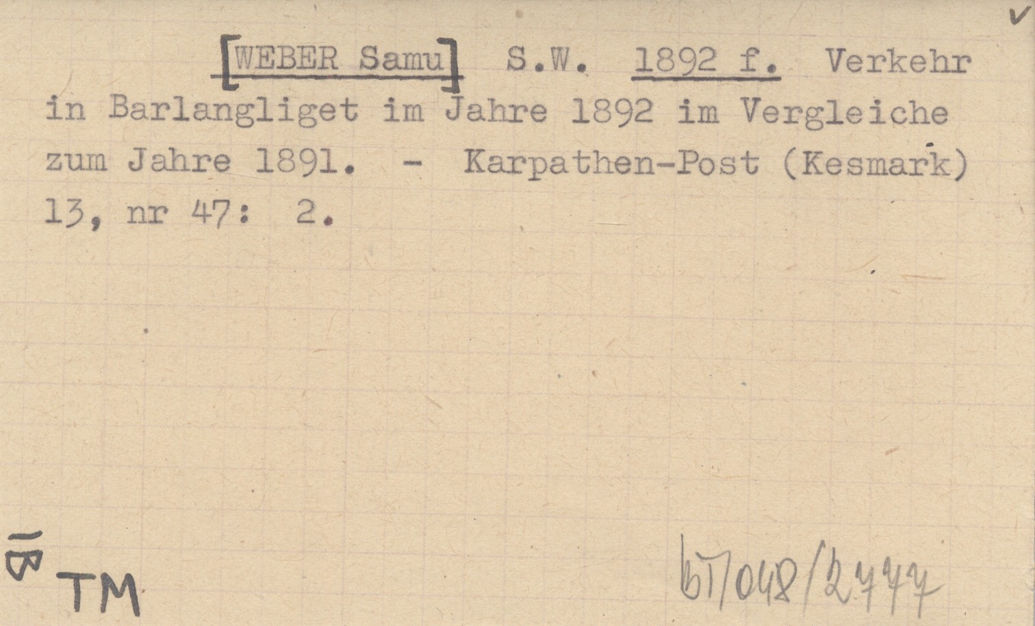S.W. [WEBER Samu] 1892 f Verkehr in Barlangliget im Jahre 1892 im Vergleiche zum Jahre 1891.