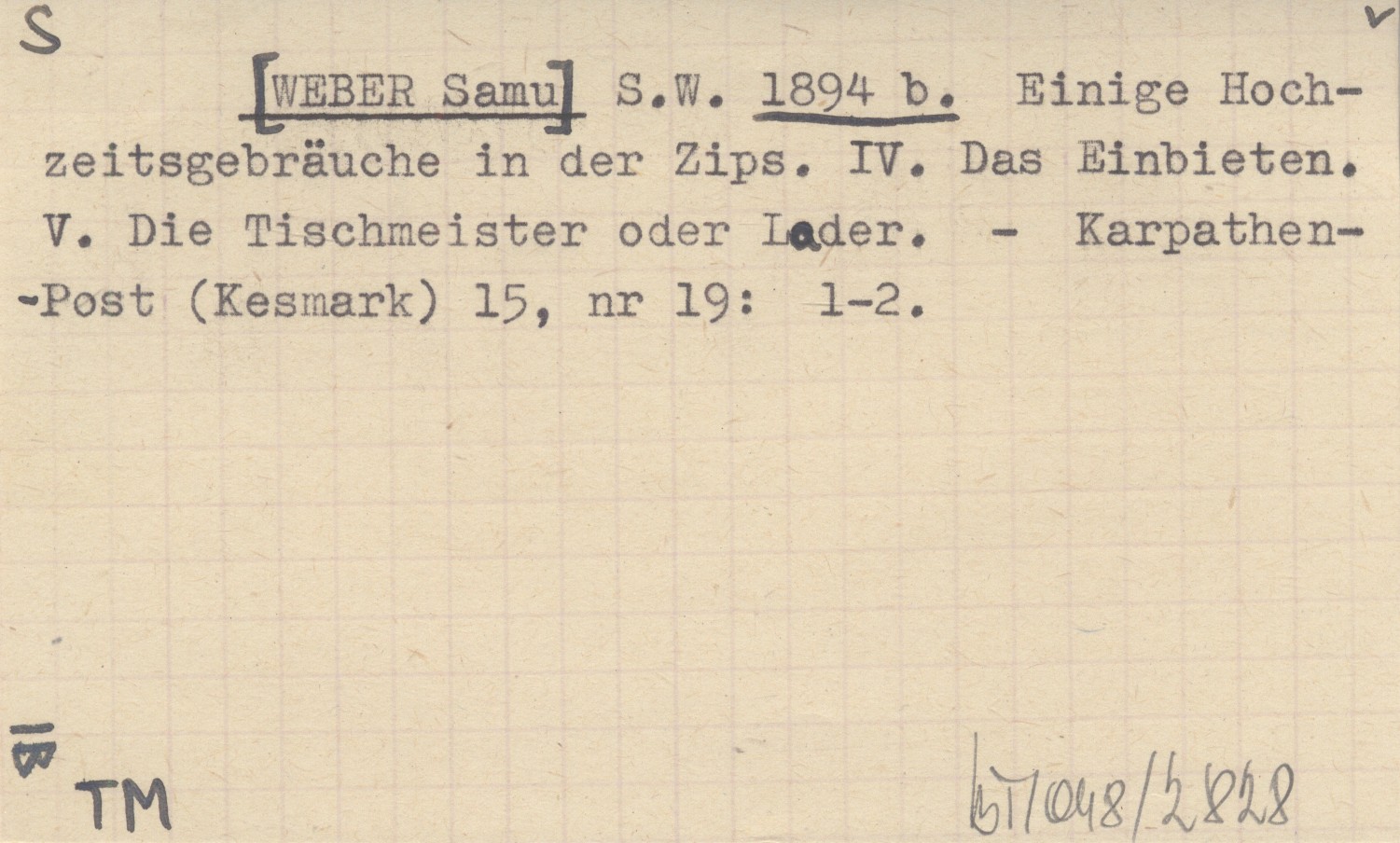 S.W. [WEBER Samu] 1894 b Einige Hochzeitsgebräuche in der Zips. IV. Das Einbieten. V. Die Tischmeister oder Lader.