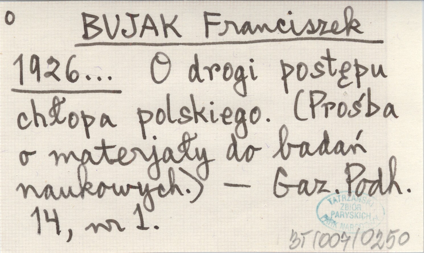 BUJAK Franciszek 1926... O drogi postępu chłopa polskiego. (Prośba o materjały do badań naukowych.)