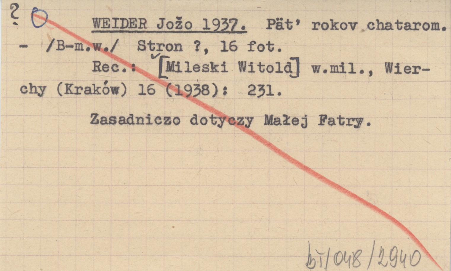 B-m.w. , 16 fot. Zasadniczo dotyczy Małej Fatry. REC: [MILESKI Witold] w.mil., Wierchy (Kraków) 16 (1938): 231.