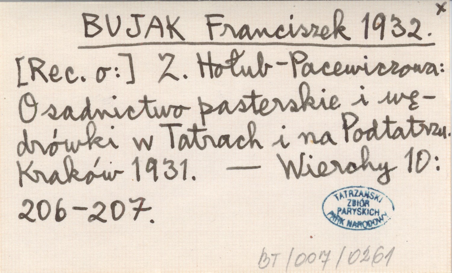 BUJAK Franciszek 1932 [Rec. o:] Z. Hołub-Pacewiczowa: Osadnictwo pasterskie i wędrówki w Tatrach i na Podtatrzu. Kraków 1931.