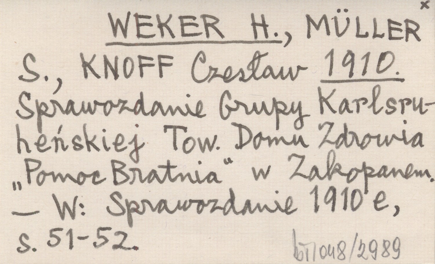 WEKER H. MÜLLER, S. ; KNOFF, Czesław. ; 1910 Sprawozdanie Grupy Karlsruheńskiej Tow. Domu Zdrowia "Pomoc Bratnia" w Zakopanem.
