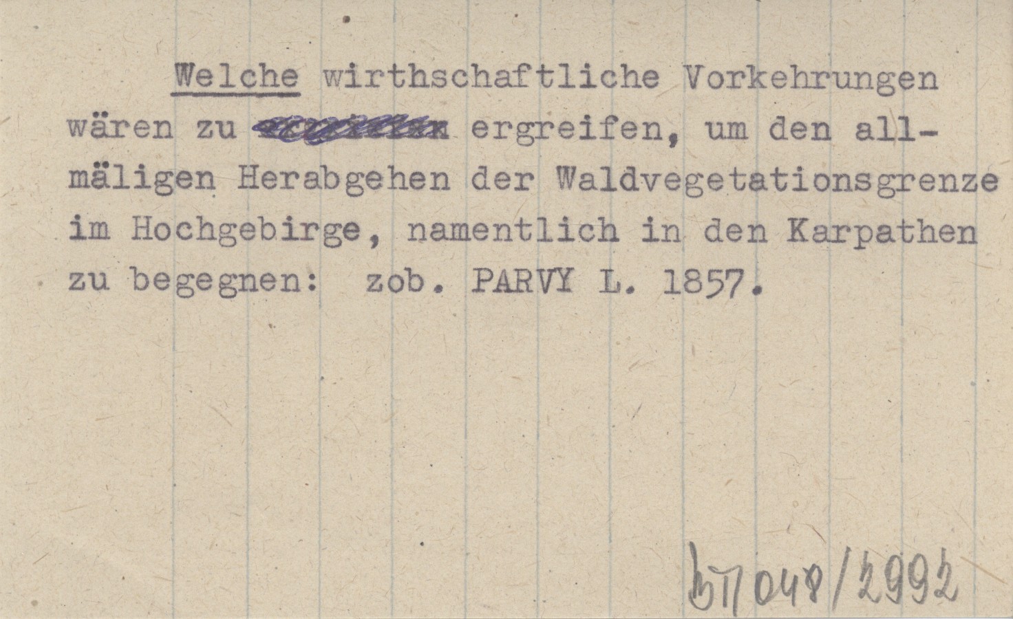 Welche wirthschaftliche Vorkehrungen wären zu ergreifen, um den allmäligen Herabgehen der Waldvegetationsgrenze im Hochgebirge, namentlich in den Karpathen zu begegnen.