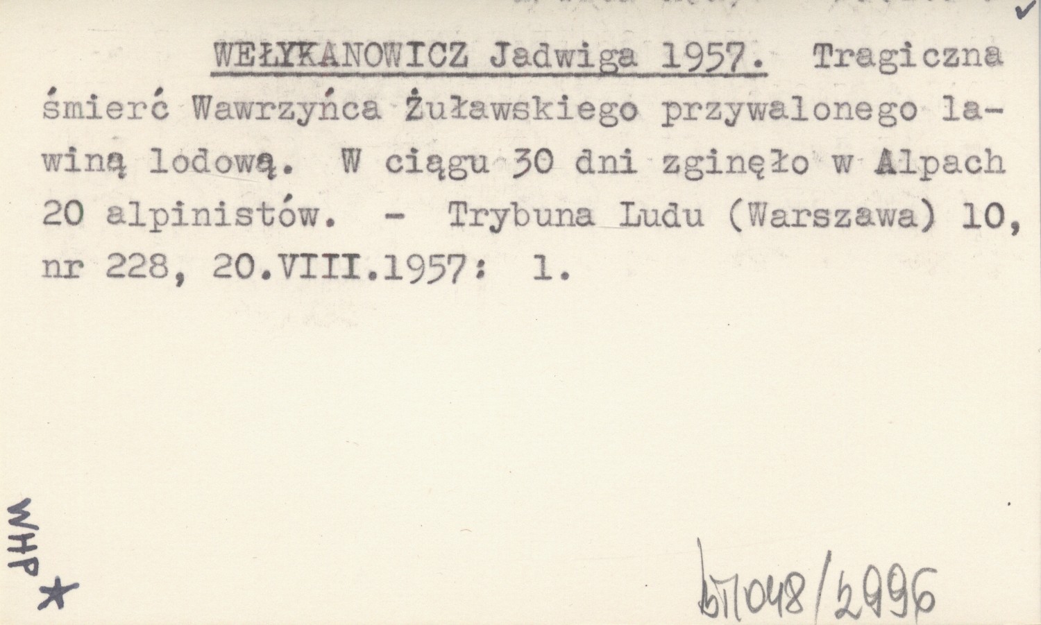 WEŁYKANOWICZ Jadwiga 1957 Tragiczna śmierć Wawrzyńca Żuławskiego przywalonego lawiną lodową. W ciągu 30 dni zginęło w Alpach 20 alpinistów.