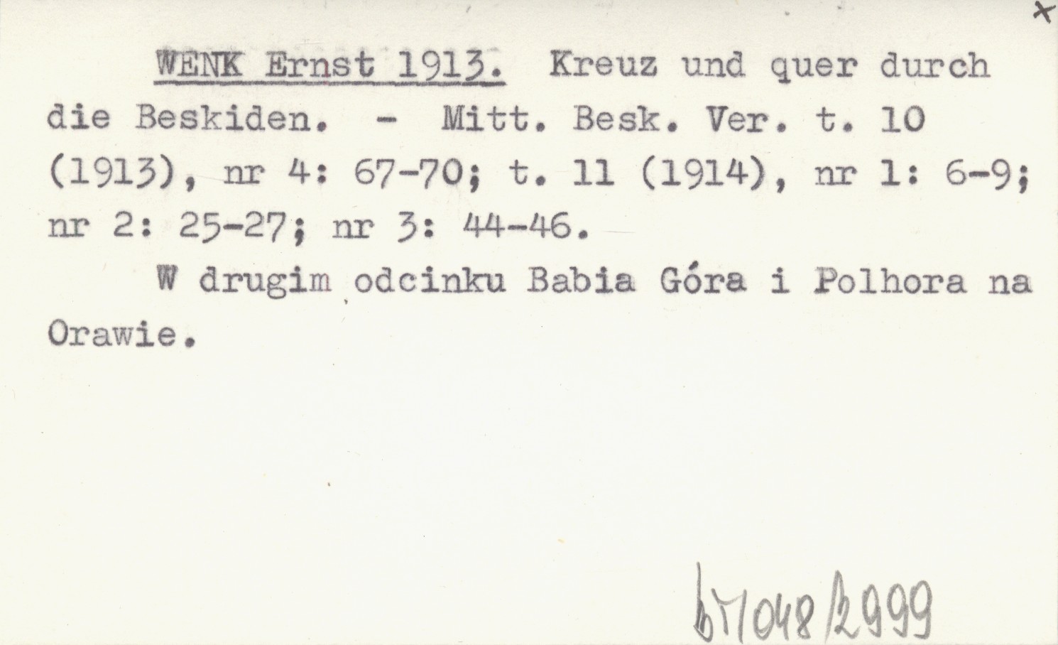 Mitteilungen des Beskiden-Vereines, T. 10 (1913), nr 4: 67-70 ; t. 11 (1914), nr 1: 6-9 ; nr 2: 25-27 ; nr 3: 44-46. W drugim odcinku Babia Góra i Polhora na Orawie.