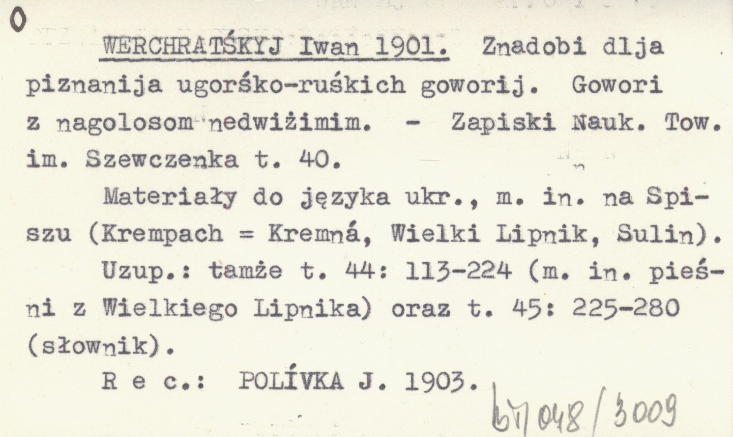 Zapiski Naukowe Towarzystwa im. Szewczenka, T. 40. Materiały do języka ukr., m.in. na Spiszu (Krempach = Kremná, Wielki Lipnik, Sulin). Uzup.: tamże t. 44: 113-224 (m.in. pie¶ni z Wielkiego Lipnika) oraz t. 45: 225-280 (słownik). REC: POLÍVKA J. 1903