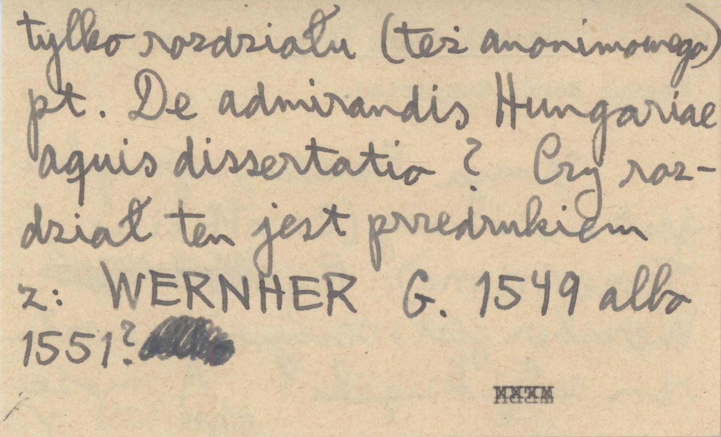, Uwaga. Posiadany egzemplarz jest anonimowy (Ex officina Elzeviriana). Czy Wernher jest rzeczywiście autorem całej książki? A może tylko rozdziału (też anonimowego) pt. De admirandis Hungariae aquis dissertatio? Czy rozdział ten jest przedrukiem z: WERNHER G. 1549 albo 1551?