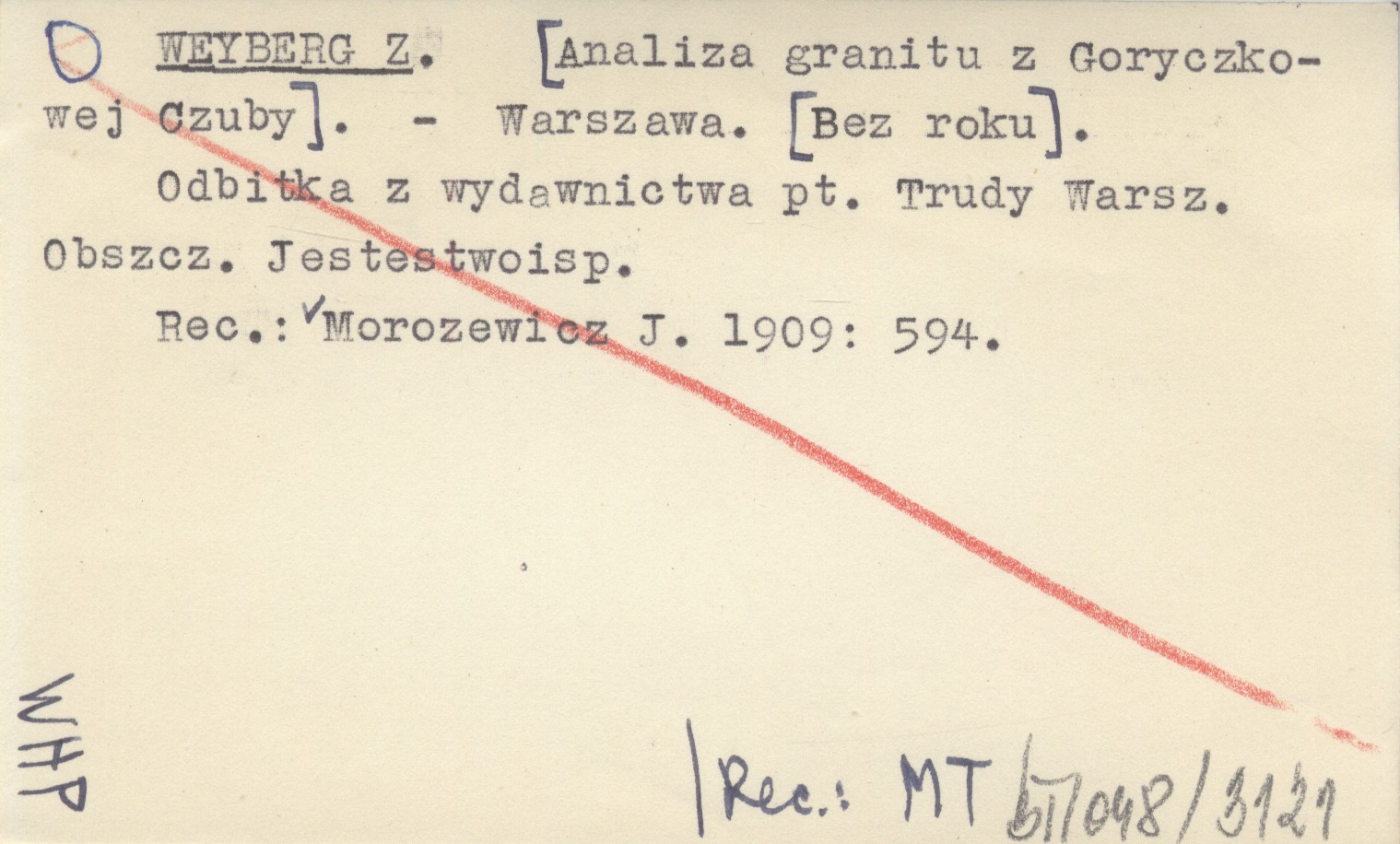 Warszawa , [Bez roku]. Odbitka z wydawnictwa pt. Trudy Warsz. Obszcz. Jestestwoisp. REC: MOROZEWICZ J. 1909: 594.