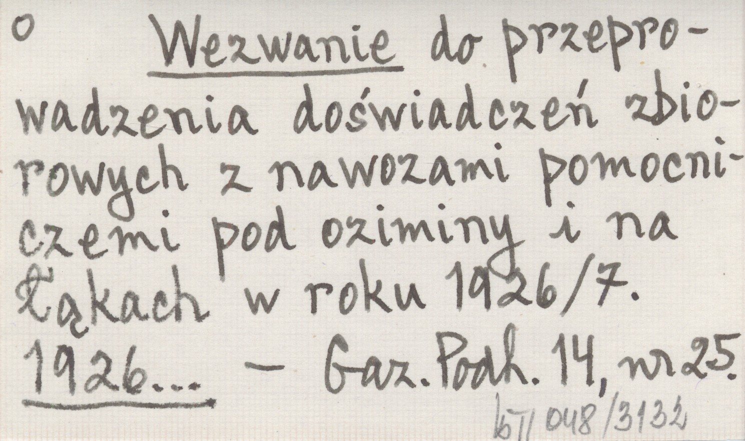 Wezwanie do przeprowadzenia doświadczeń zbiorowych z nawozami pomocniczemi pod oziminy i na łąkach w roku 1926/7. 1926...