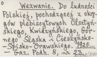 Wezwanie. Do ludności Polskiej, pochodzącej z okręgów plebiscytowych Olsztyńskiego, Kwidzyńskiego, Górnego Śląska i Cieszyńsko-Spisko-Orawskiego. 1920...