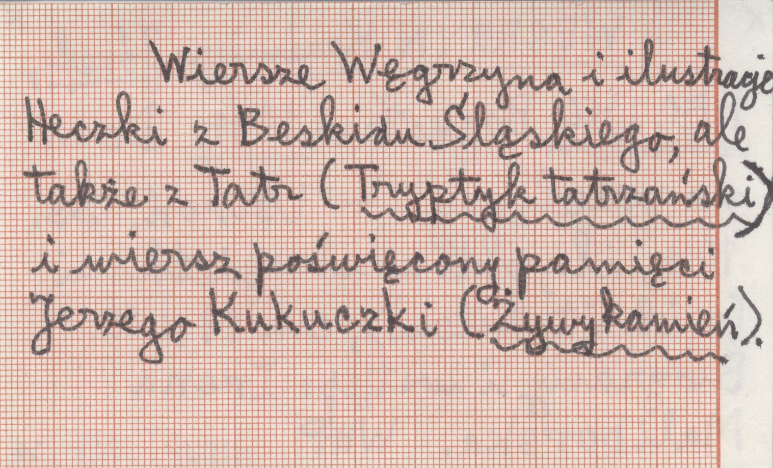 Ustroń , 104 s., il., okł. (ze skrzydełkami, il., tekst), 19x10 cm. Wiersze Węgrzyna i ilustracje Heczki z Beskidu Śląskiego, ale także z Tatr (Tryptyk tatrzański) i wiersz poświęcony pamięci Jerzego Kukuczki (Żywy kamień). Biogramy i wstęp: Irena Maliborska.