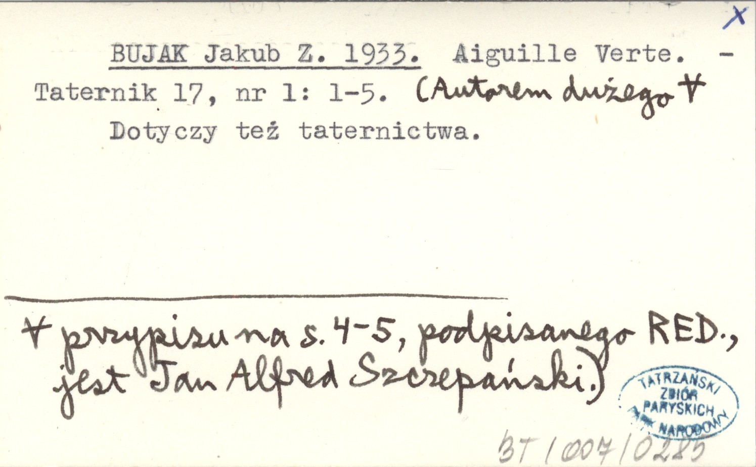 Taternik, 17, nr 1: 1-5. (Autorem dużego przypisu na s. 4-5, podpisanego RED., jest Jan Alfred Szczepański.) Dotyczy taternictwa.