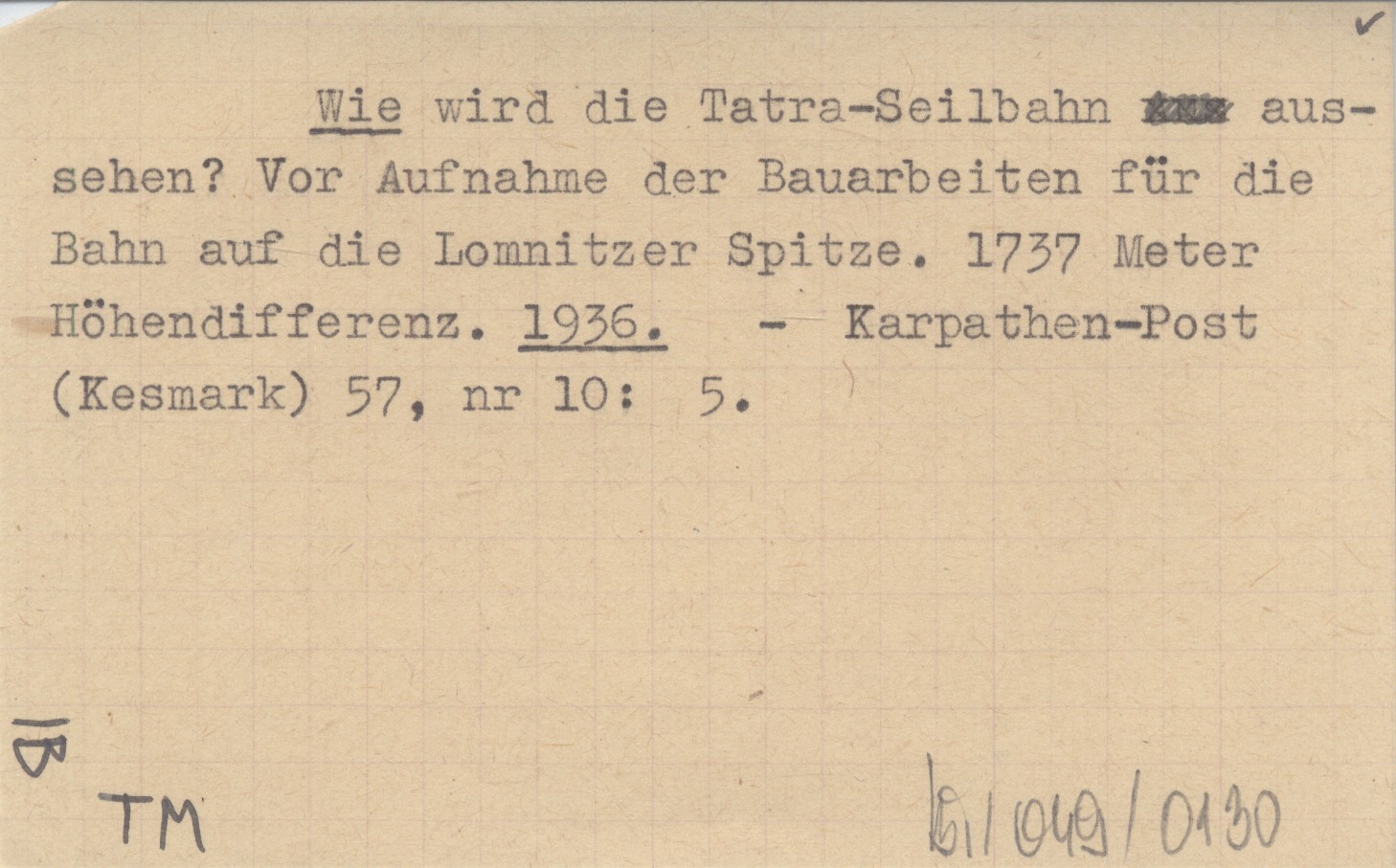 Wie wird die Tatra-Seilbahn aussehen? Vor Aufnahme der Bauarbeiten für die Bahn auf die Lomnitzer Spitze. 1737 Meter Höhendifferenz. 1936