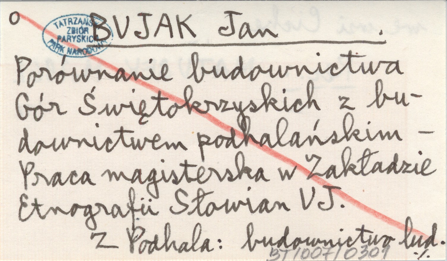BUJAK Jan Porównanie budownictwa Gór Świętokrzyskich z budownictwem podhalańskim. Praca magisterska w Zakładzie Etnografii Słowian UJ.