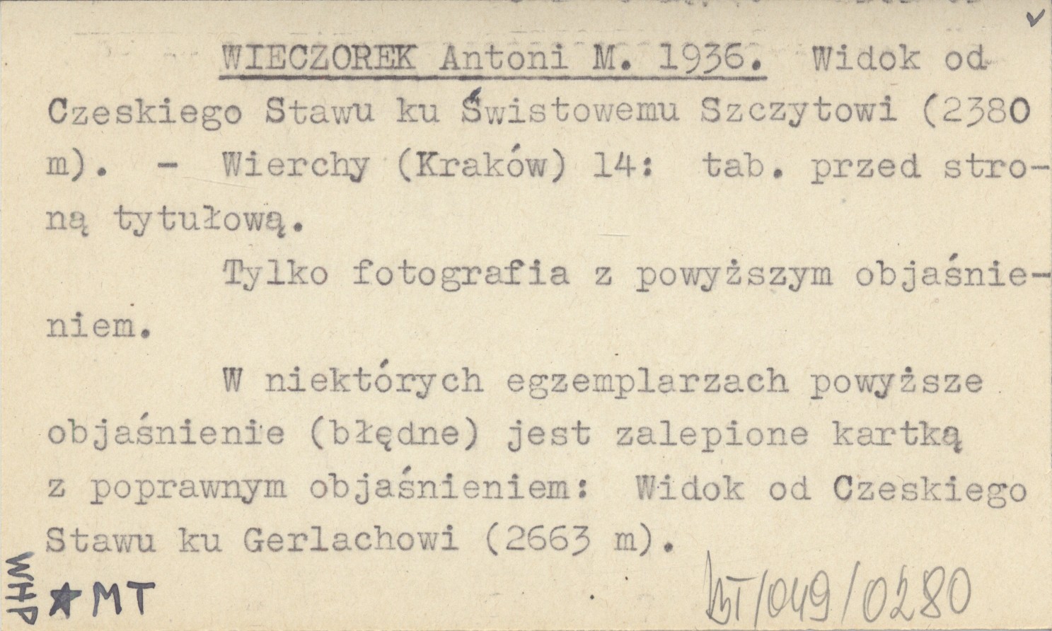 Wierchy (Kraków) , 14: k. tabl. (przed s. tyt.). Tylko fotografia z powyższym objaśnieniem. W niektórych egzemplarzach powyższe objaśnienie (błędne) jest zalepione kartką z poprawnym objaśnieniem: Widok od Czeskiego Stawu ku Gerlachowi (2663 m).