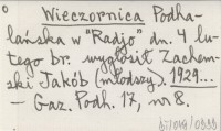 Wieczornica Podhalańska w "Radjo" dn. 4 lutego br. wygłosił Zachemski Jakób (młodszy). 1929...