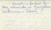 Sekcya Turystyczna Towarzystwa Tatrzańskiego, [Zakopane] , S. 3, il., 30x20 cm. Program koncertu. Koncert na fundusz budowy schroniska im. Mieczysława Karłowicza w Tatrach. Druk: W. L. Anczyc i Spółka, Kraków.