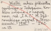 Wielki sukces jeździectwa cywilnego w Zakopanem. Konkurs imienia i o nagrodę nacz. red. "I.K.C." M. Dąbrowskiego wygrał p. Strzeszewski. 1938