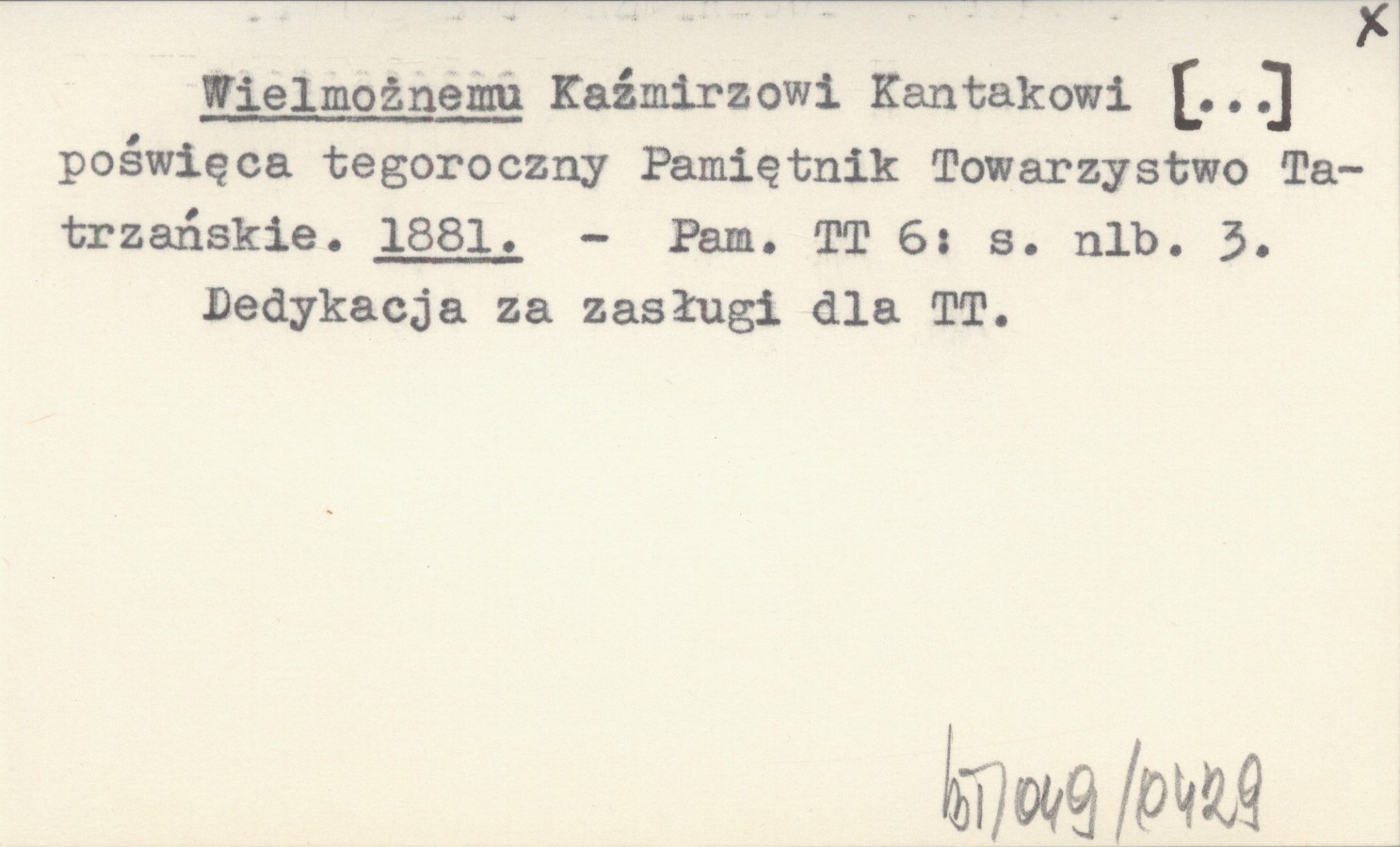 Wielmożnemu Kaźmirzowi Kantakowi [...] poświęca tegoroczny Pamiętnik Towarzystwo Tatrzańskie. 1881