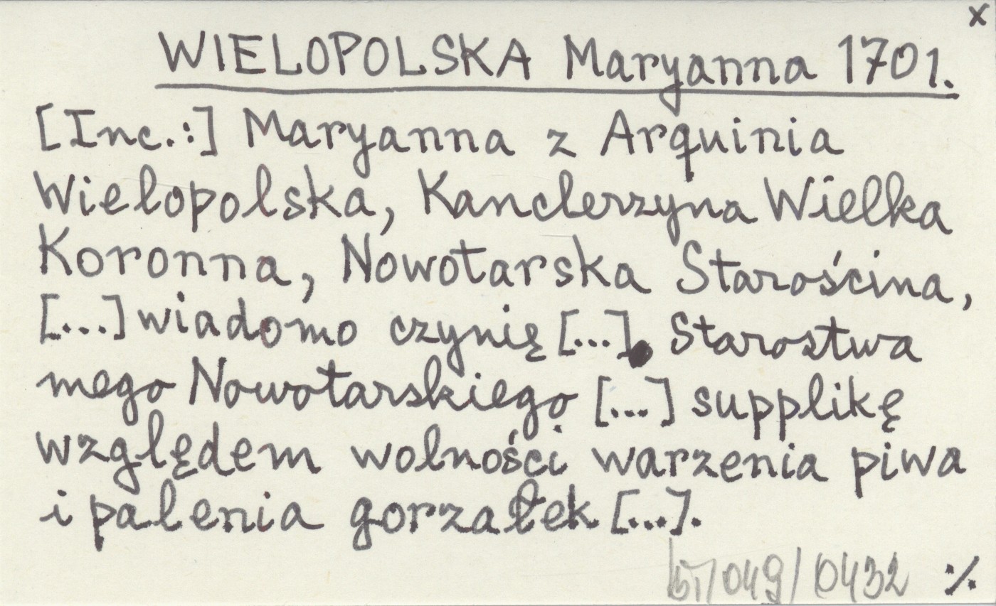 WIELOPOLSKA Maryanna 1701 Maryanna z Arquinia Wielopolska, Kanclerzyna Wielka Koronna, Nowotarska Starościna, [...] wiadomo czynię [...] Starostwa mego Nowotarskiego [...] supplikę względem wolności warzenia piwa i palenia gorzałek [...].