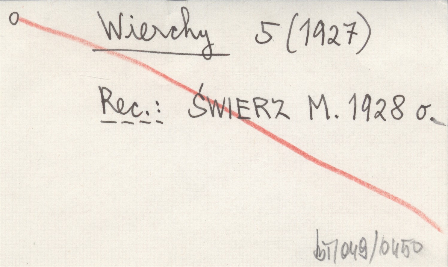 Wierchy, 5 (1927). REC: ŚWIERZ M. 1928 o ; ZBOROWSKI J. 1928... ; J. B., Orli Lot (Kraków) 9 (1928), nr 7-8: 175-176 ;