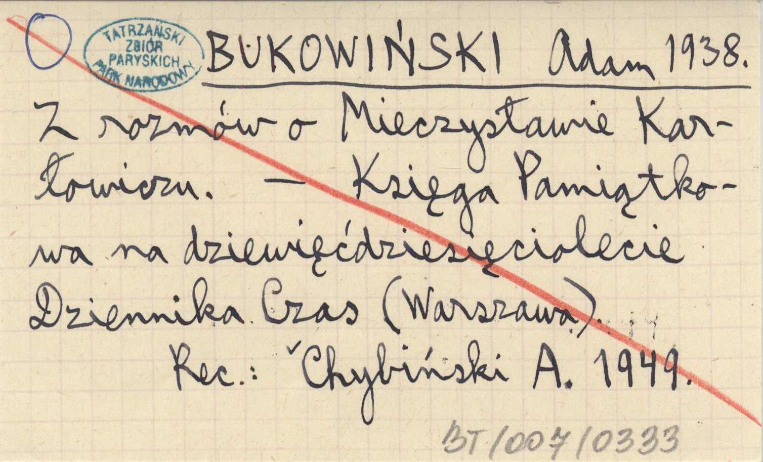Księga Pamiątkowa na dziewięćdziesięciolecie Dziennika Czas. Warszawa , REC: CHYBIŃSKI A. 1949