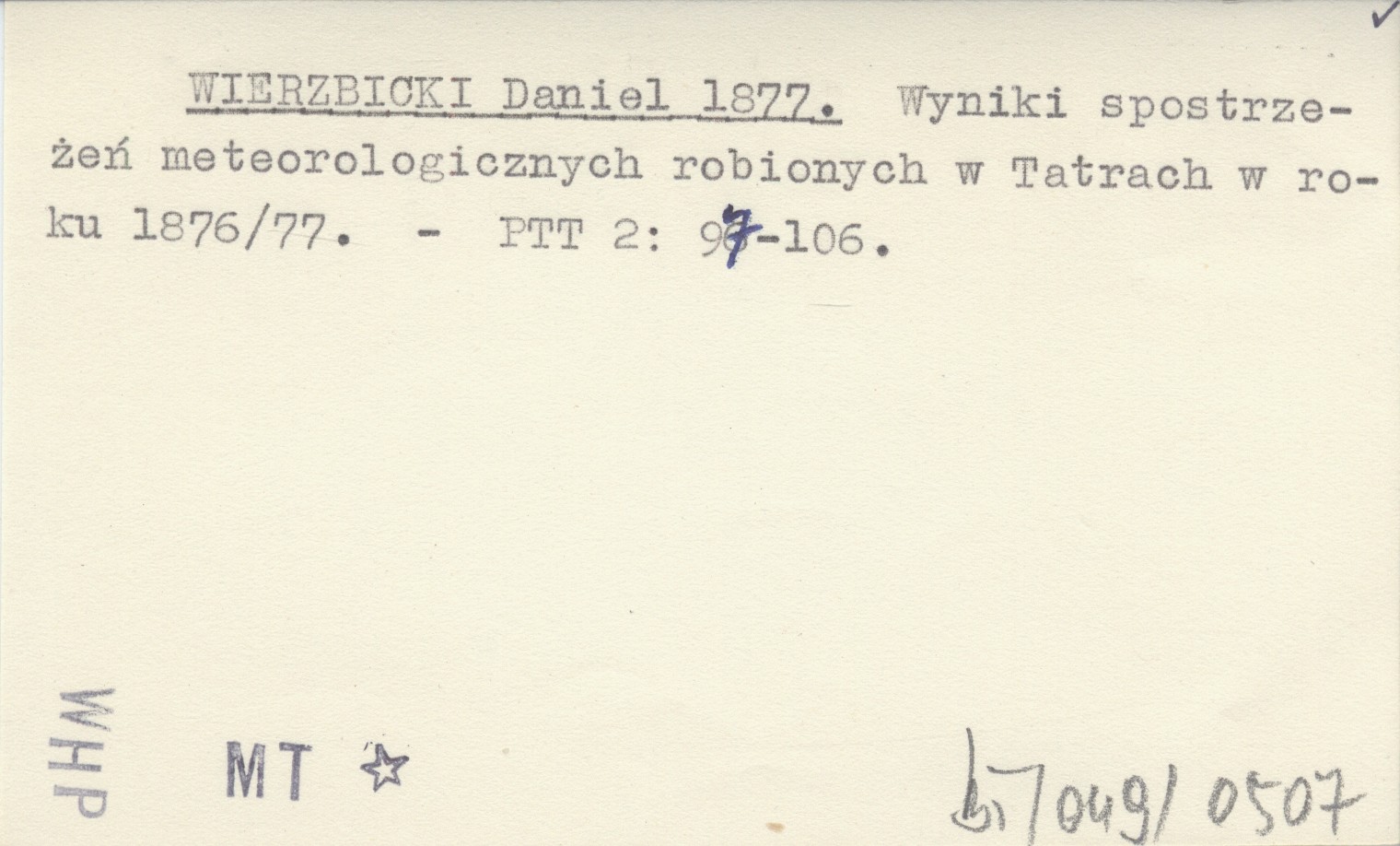 WIERZBICKI Daniel 1877 Wyniki spostrzeżeń meteorologicznych robionych w Tatrach w roku 1876/77.