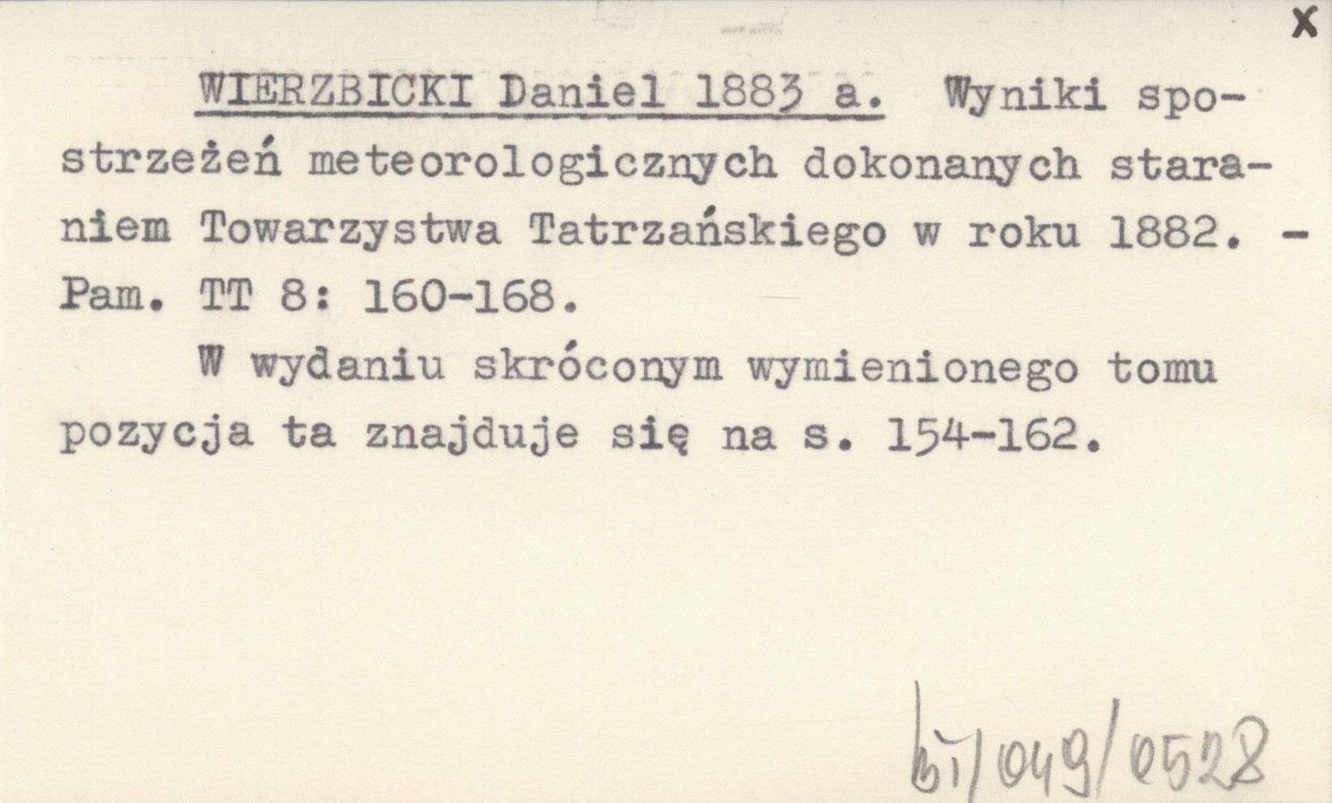 WIERZBICKI Daniel 1883 a Wyniki spostrzeżeń meteorologicznych dokonanych staraniem Towarzystwa Tatrzańskiego w roku 1882.