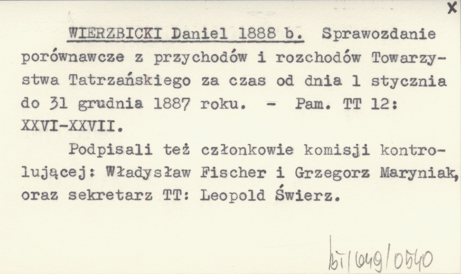 WIERZBICKI Daniel 1888 b Sprawozdanie porównawcze z przychodów i rozchodów Towarzystwa Tatrzańskiego za czas od dnia 1 stycznia do 31 grudnia 1887 roku.