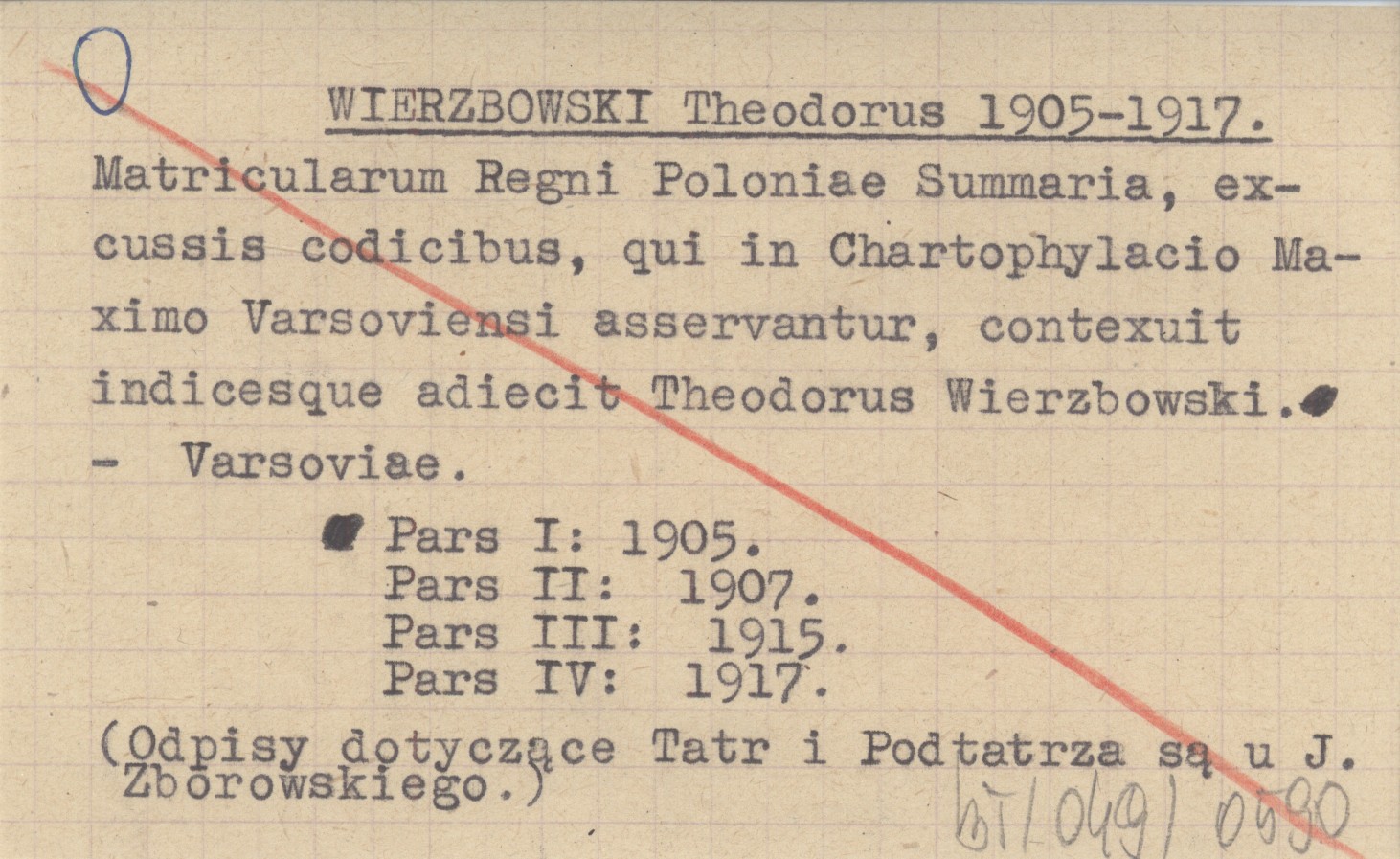 Varsoviae , Pars I: 1905 ; Pars II: 1907 ; Pars III: 1915 ; Pars IV: 1917. Odpisy dotyczące Tatr i Podtatrza są u J. Zborowskiego.