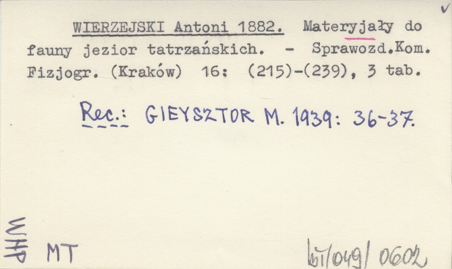 WIERZEJSKI Antoni 1882 Materyjały do fauny jezior tatrzańskich.