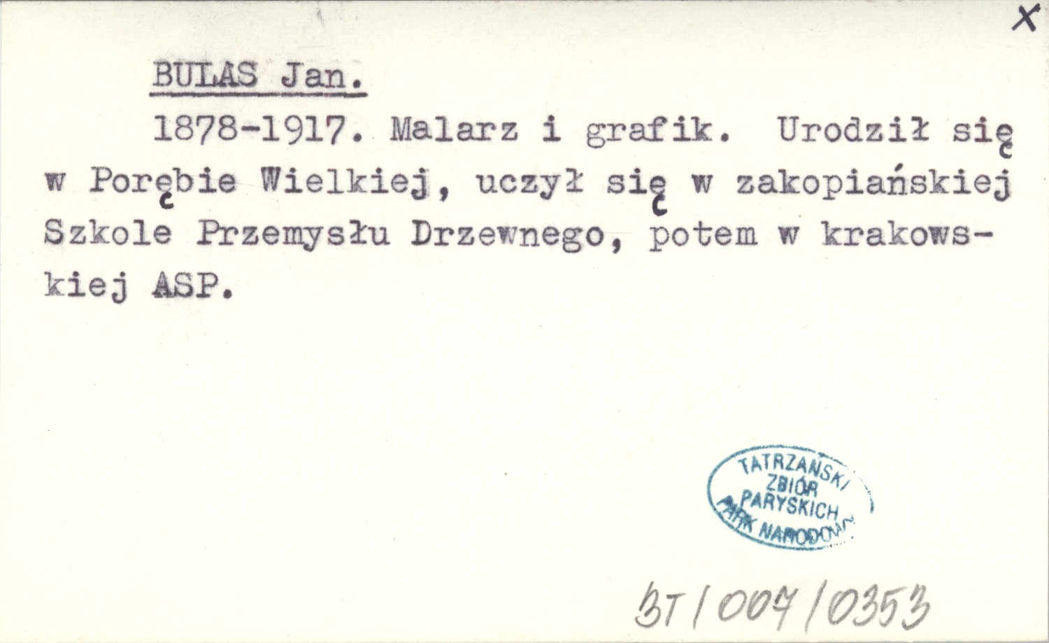 1878-1917. Malarz i grafik. Urodził się w Porębie Wielkiej, uczył się w zakopiańskiej Szkole Przemysłu Drzewnego, potem w krakowskiej ASP.