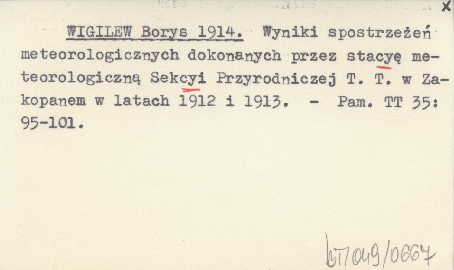 WIGILEW Borys 1914 Wyniki spostrzeżeń meteorologicznych dokonanych przez stacyę meteorologiczną Sekcyi Przyrodniczej T. T. w Zakopanem w latach 1912 i 1913.