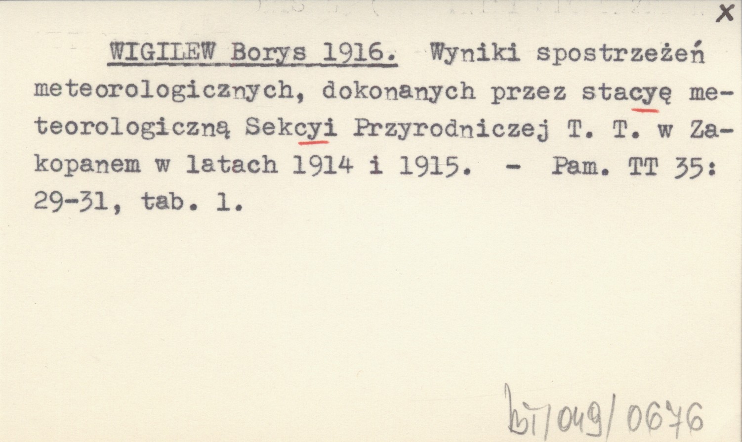 WIGILEW Borys 1916 Wyniki spostrzeżeń meteorologicznych, dokonanych przez stacyę meteorologiczną Sekcyi Przyrodniczej T. T. w Zakopanem w latach 1914 i 1915.