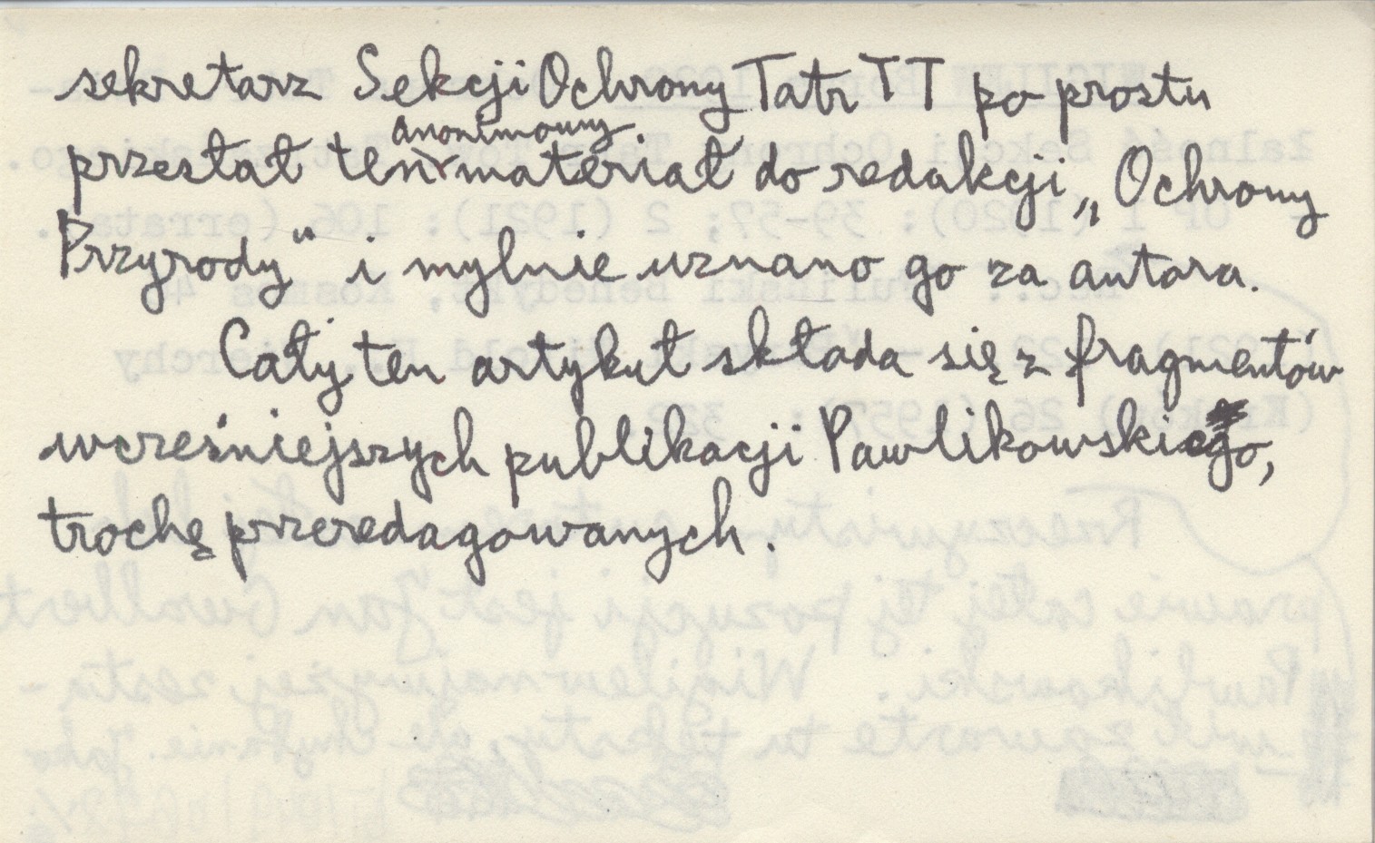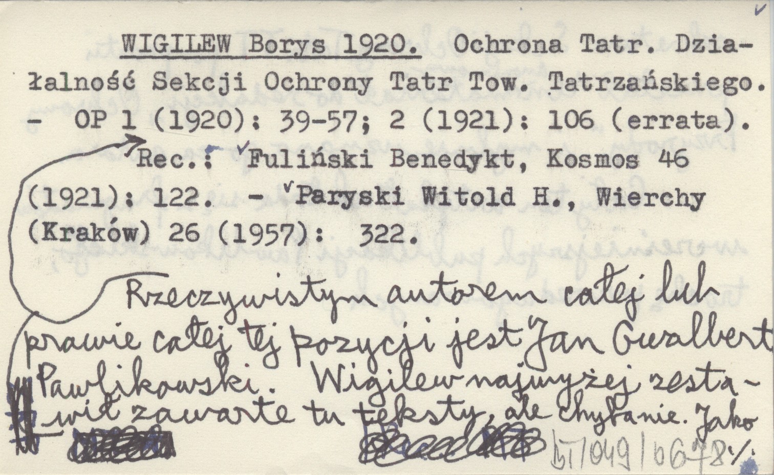 Ochrona Przyrody, 1 (1920): 39-57 ; 2 (1921): 106 (err.). Cały ten artykuł składa się z fragmentów wcześniejszych publikacji Pawlikowskiego, trochę przeredagowanych. Rzeczywistym autorem całej lub prawie całej tej pozycji jest Jan Gwalbert Pawlikowski. Wigilew najwyżej zestawił zawarte tu teksty, ale chyba nie. Jako sekretarz Sekcji Ochrony Tatr TT po prostu przesłał ten anonimowy materiał do redakcji "Ochrony Przyrody" i mylnie uznano go za autora. REC: FULIŃSKI Benedykt, Kosmos 46 (1921): 122 ; PARYSKI Witold H., Wierchy (Kraków) 26 (1957): 322 ;