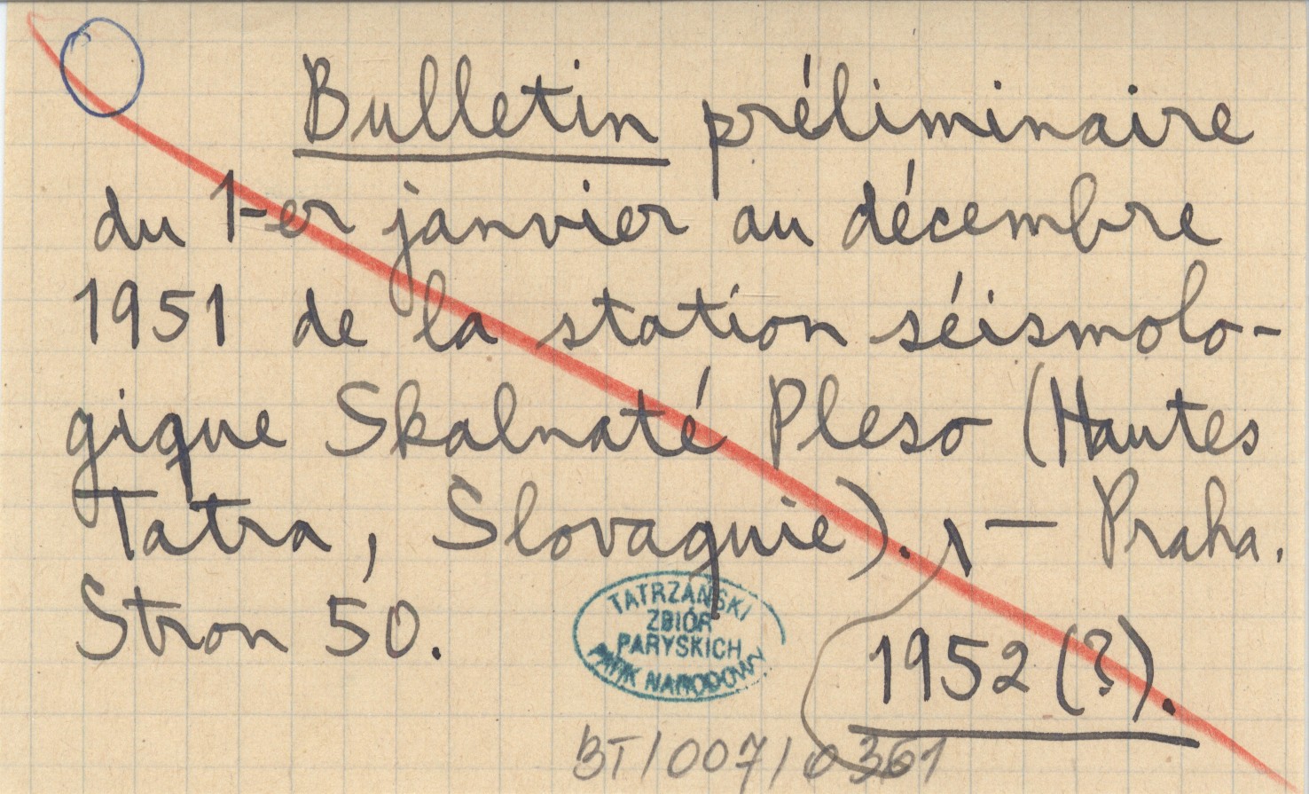 Bulletin préliminaire du 1-er janvier au décembre 1951 de la station séismologique Skalnaté Pleso (Hautes Tatra, Slovaquie). 1952 (?)