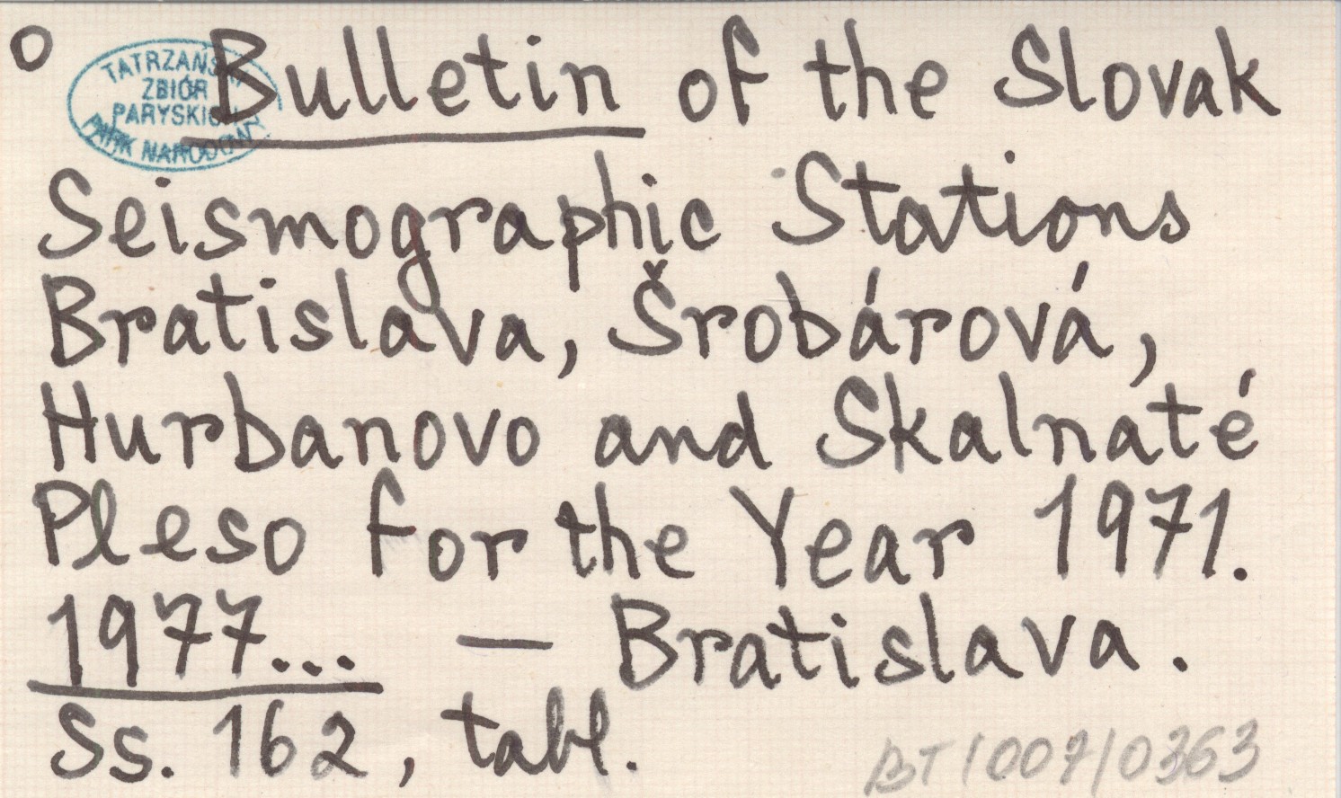 Bulletin of the Slovak Seismographic Station Bratislava, Šrobárová, Hurbanovo and Skalnaté Pleso for the Year 1971. 1977...