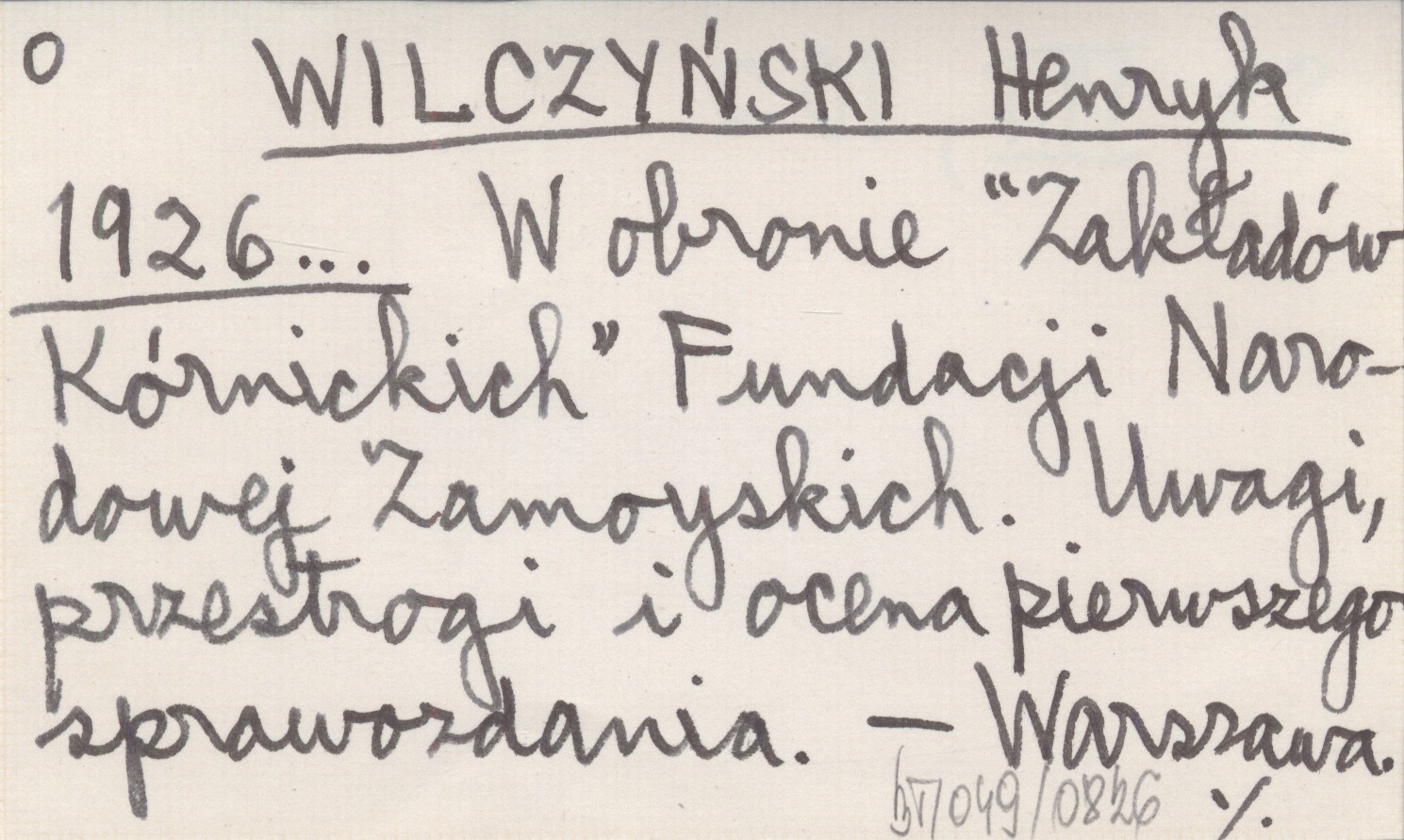WILCZYŃSKI Henryk 1926... W obronie "Zakładów Kórnickich" Fundacji Narodowej Zamoyskich. Cz. I. Uwagi, przestrogi i ocena pierwszego sprawozdania.