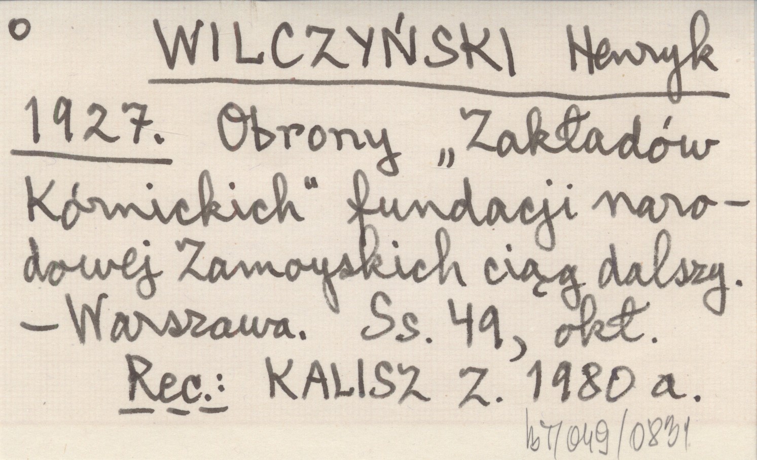 WILCZYŃSKI Henryk 1927 Obrony "Zakładów Kórnickich" fundacji narodowej Zamoyskich ciąg dalszy.