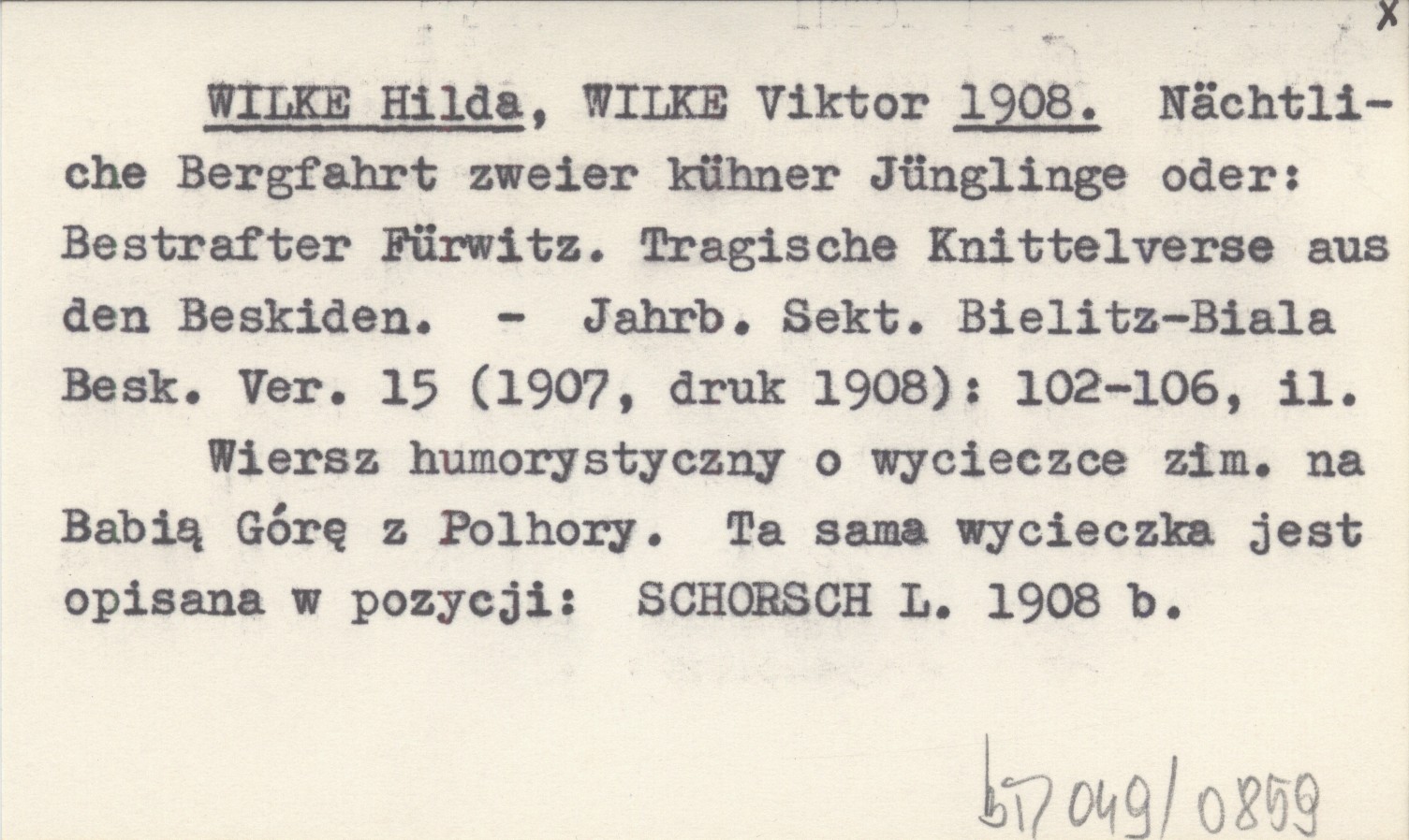 Jahrbuch der Sektion Bielitz-Biala des Beskidenvereines, 15 (1907, druk 1908): 102-106, il. Wiersz humorystyczny o wycieczce zim. na Babią Górę z Polhory. Ta sama wycieczka jest opisana w pozycji: SCHORSCH L. 1908 b.