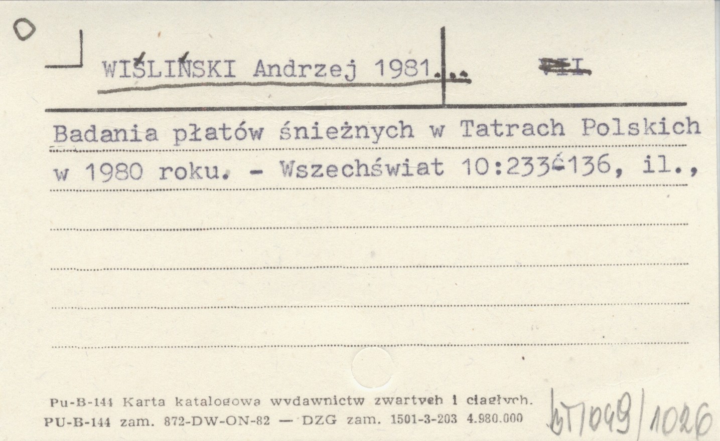 WIŚLIŃSKI Andrzej 1981... Badania płatów śnieżnych w Tatrach Polskich w 1980 roku.