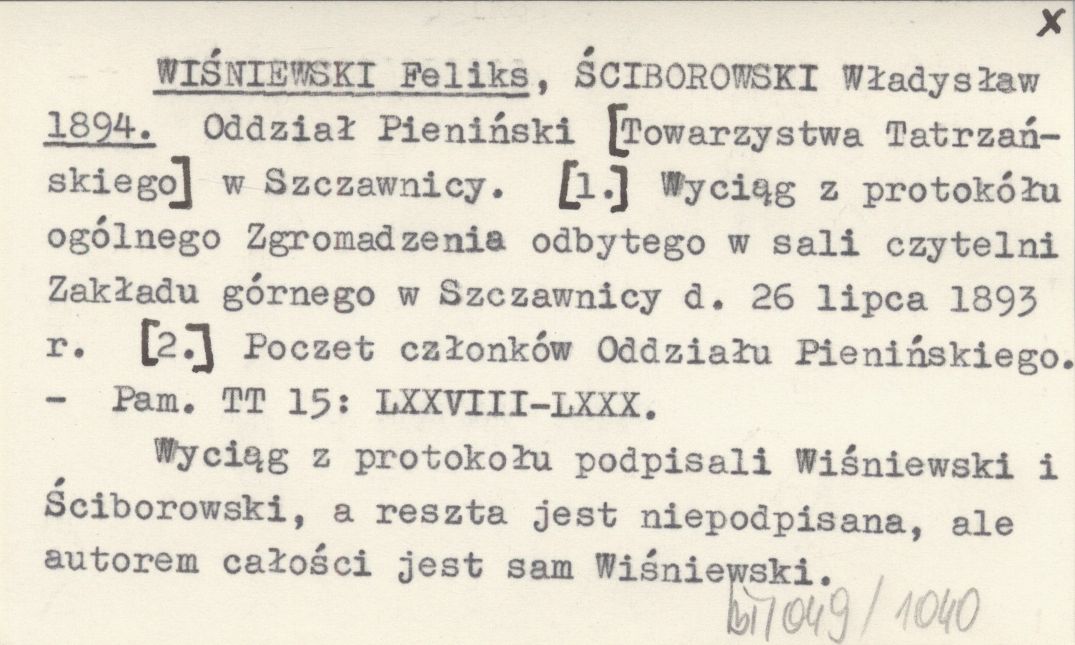 Pamiętnik Towarzystwa Tatrzańskiego, 15: LXXVIII-LXXX. Wyciąg z protokołu podpisali Wiśniewski i Ściborowski, a reszta jest niepodpisana, ale autorem całości jest sam Wiśniewski.
