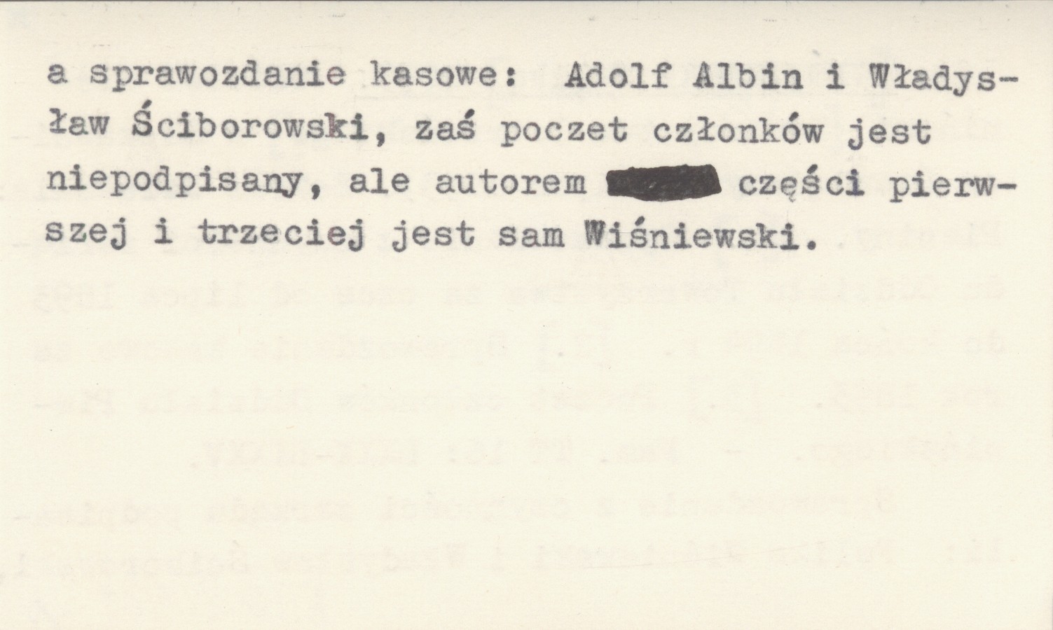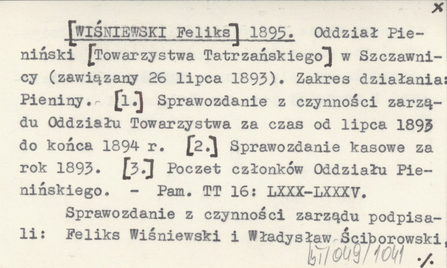 Pamiętnik Towarzystwa Tatrzańskiego, 16: LXXX-LXXXV. Sprawozdanie z czynności zarządu podpisali: Feliks Wiśniewski i Władysław Ściborowski, a sprawozdanie kasowe: Adolf Albin i Władysław Ściborowski, zaś poczet członków jest niepodpisany, ale autorem części pierwszej i trzeciej jest sam Wiśniewski.