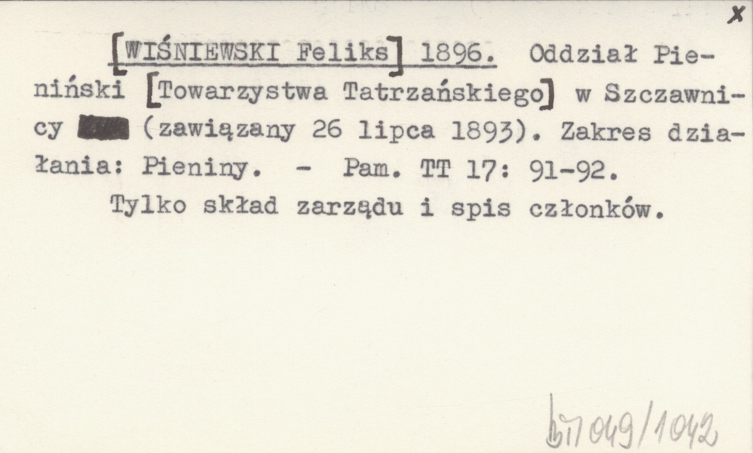 [WIŚNIEWSKI Feliks] 1896 Oddział Pieniński [Towarzystwa Tatrzańskiego] w Szczawnicy (zawiązany 26 lipca 1893). Zakres działania: Pieniny.