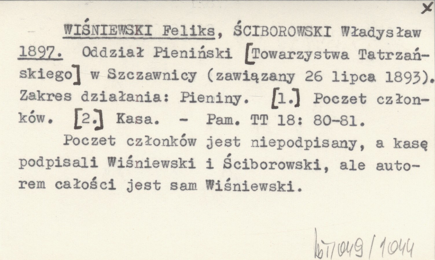 WIŚNIEWSKI Feliks ŚCIBOROWSKI, Władysław. ; 1897 Oddział Pieniński [Towarzystwa Tatrzańskiego] w Szczawnicy (zawiązany 26 lipca 1893). Zakres działania: Pieniny. [1.] Poczet członków. [2.] Kasa.